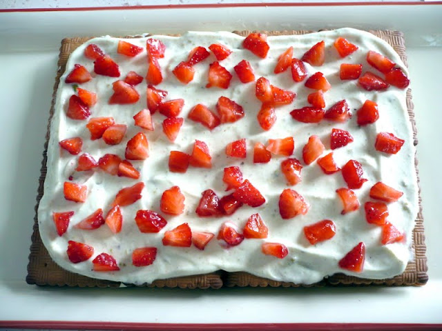 5. Étalez une couche de crème puis environ 6 ou 7 fraises coupées en tout petits morceaux, bien réparties.