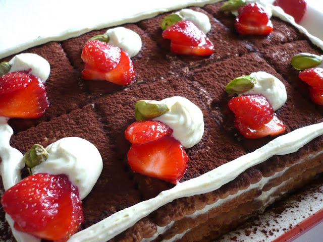 7. Saupoudrez de cacao et décorez de fraises et de pistaches. Mettez au frais pendant au moins 2 h.