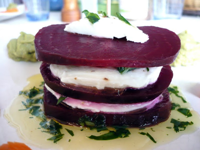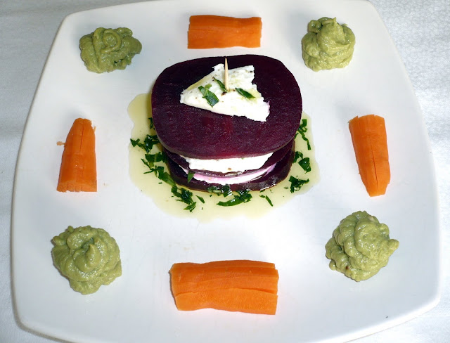 Mille-feuille betterave-mozzarella, crème d’avocat et carottes croquantes