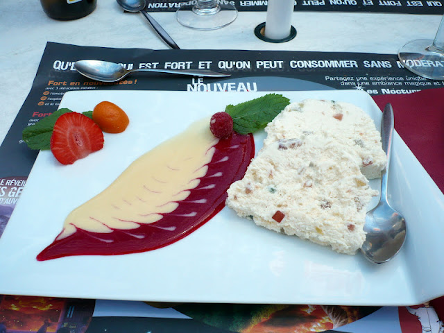 Là, ce n’était pas vraiment des spécialités mais c’était tellement bon et joli, que je vous les montre aussi : les desserts qui ont suivi les deux plats précédents, à savoir un café gourmand pour le Doudou et un nougat glacé maison au miel d’Auvergne pour moi ! Un régal !