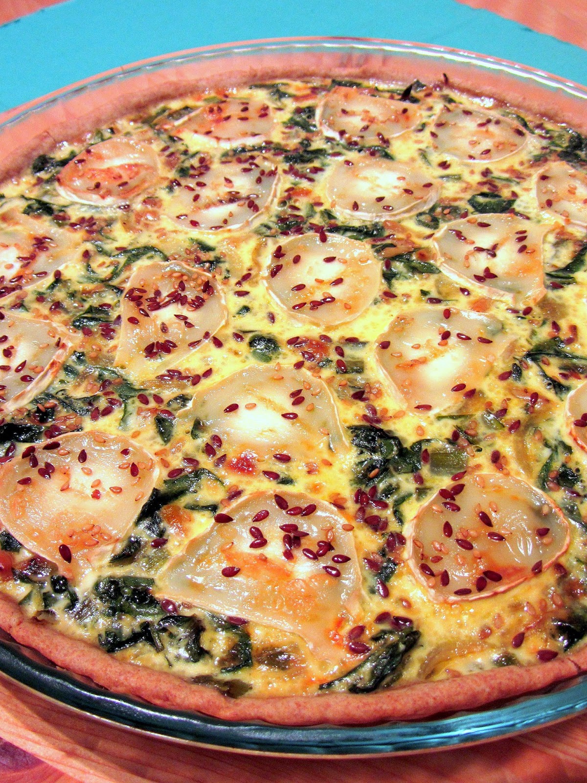 7. Préparez l’appareil à quiche en mélangeant tous les ingrédients indiqués et versez sur les légumes.