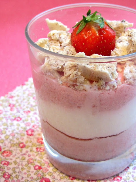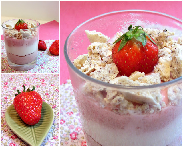 11. Au moment de servir, décorez d’une fraise et de meringues concassées. Si vous n’avez pas de meringues, tout autre biscuit fera très bien l’affaire.
