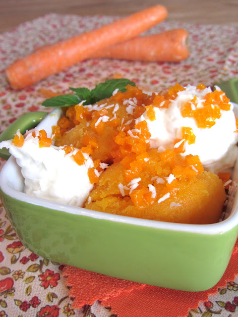 Sorbet carotte-pêche, brunoise de carotte confite et chantilly noix de coco