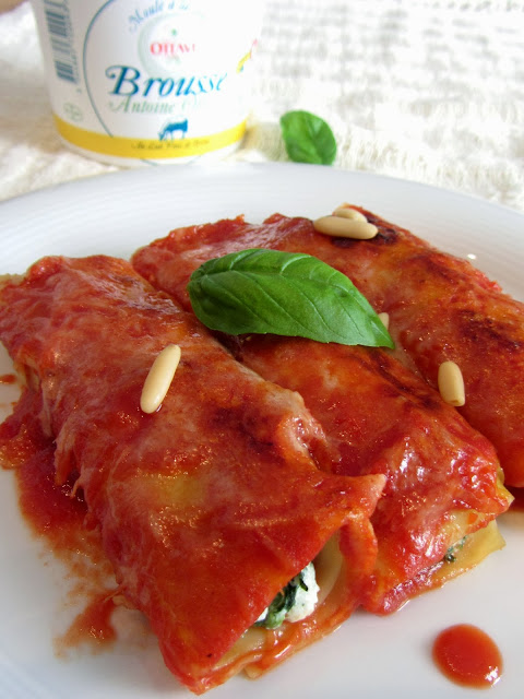 je partage les feuillles de lasagne en deux et je les précuis dans du bouillon. N'ayant pas de brocciu, j'utilise de la ricotta. Très bon avec du vert de blettes blanchi, des épinards cuits et/ou de la roquette.