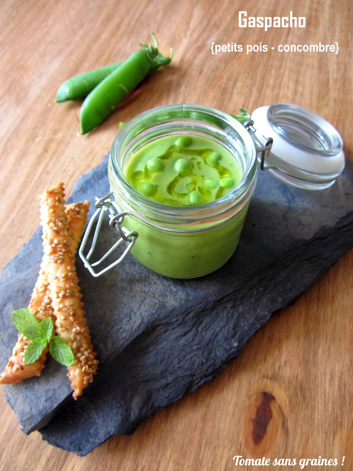 Alors, après le gaspacho de concombre, tomate et menthe que je vous proposais l’année dernière, place au petit nouveau aux petits pois et au concombre. Cette fois-ci, j’ai décidé de ne pas enlever les pépins du