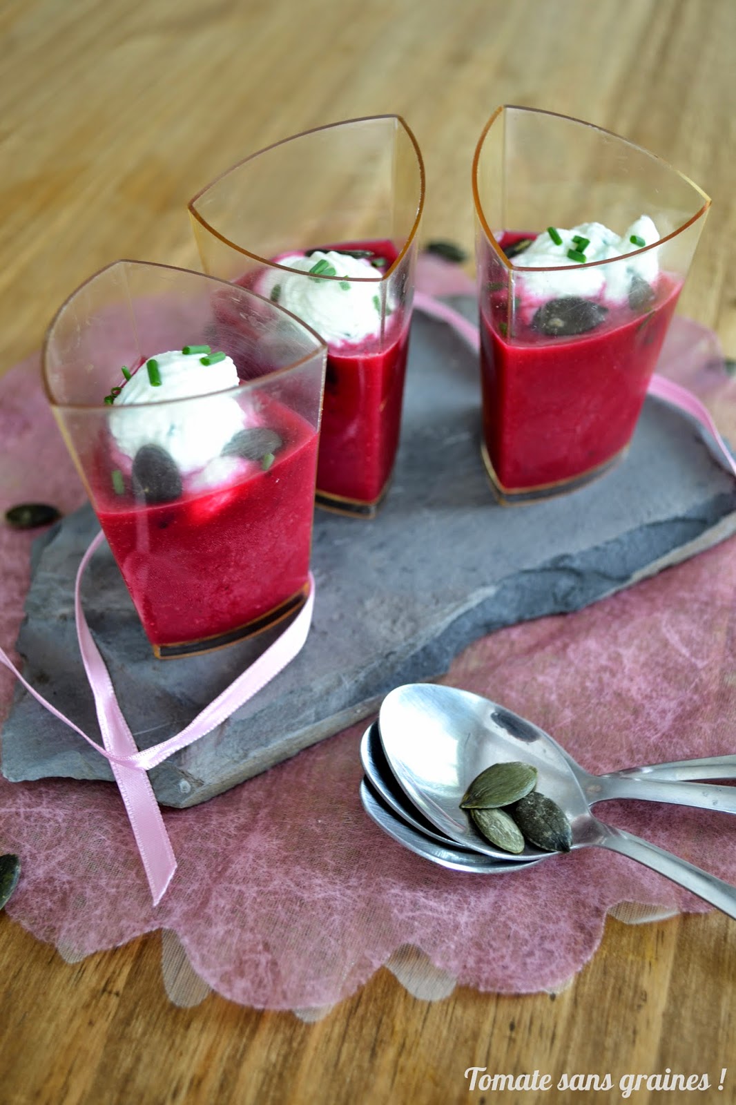 Gaspacho de betterave, chantilly au chèvre frais et à la ciboulette