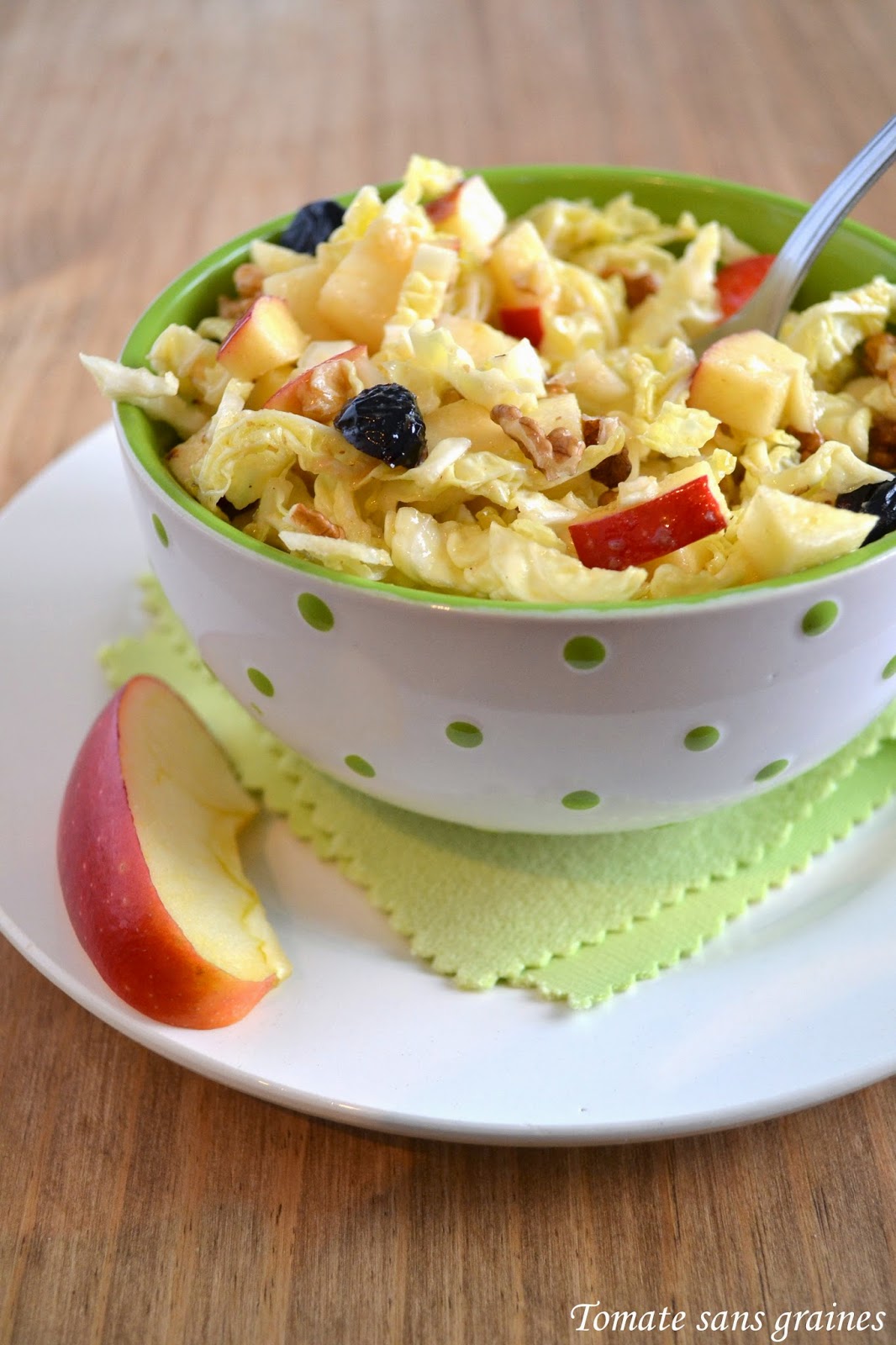 Et puis, il faut aussi composer avec les légumes d’hiver, qui sont, je trouve, un peu moins propices à la réalisation de salades que les tomates, concombres et autres poivrons. Toutefois, avec un peu d’imagination, on peut préparer de bonnes petites salades malgré tout : ici, l’ingrédient de base est le chou vert, que j’ai accommodé avec de la pomme, des noix et des cranberries, et une vinaigrette au vinaigre de framboise.