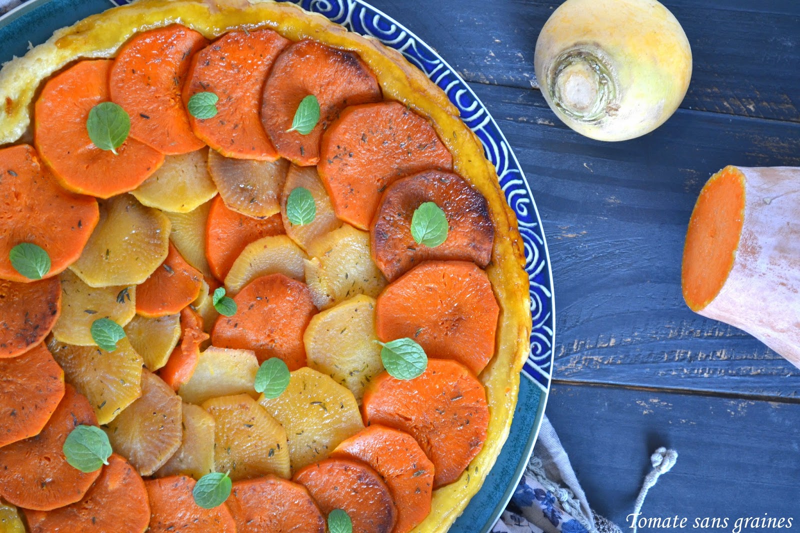 Une jolie tarte tatin colorée aux légumes tout fondants, voilà ce que je vous propose aujourd’hui. ^^ J’ai utilisé de la courge jaune de Nice, mais toute autre cucurbitacée de saison fera très bien l’affaire. De même, je suis tombée sur de beaux navets jaunes dans mon magasin bio, mais il va sans dire que des navets « classiques  » conviendront aussi.
