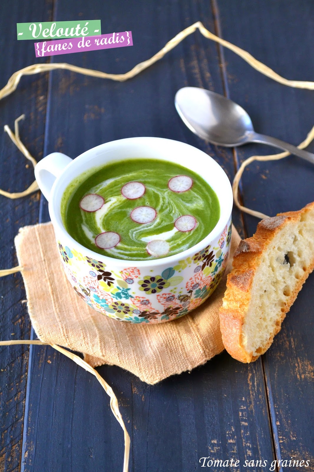 Pour changer des tartes salées et des pestos aux fanes de radis – j’en ai déjà publié de nombreuses recettes – je me mets enfin au velouté ! Certes, le velouté aux fanes de radis c’est connu, mais moi j’avoue n’avoir testé qu’ il y a peu… et j’aime beaucoup ! Si j’osais, je ferais même un jeu de mots pas du tout original en disant que j’en suis fan 😉