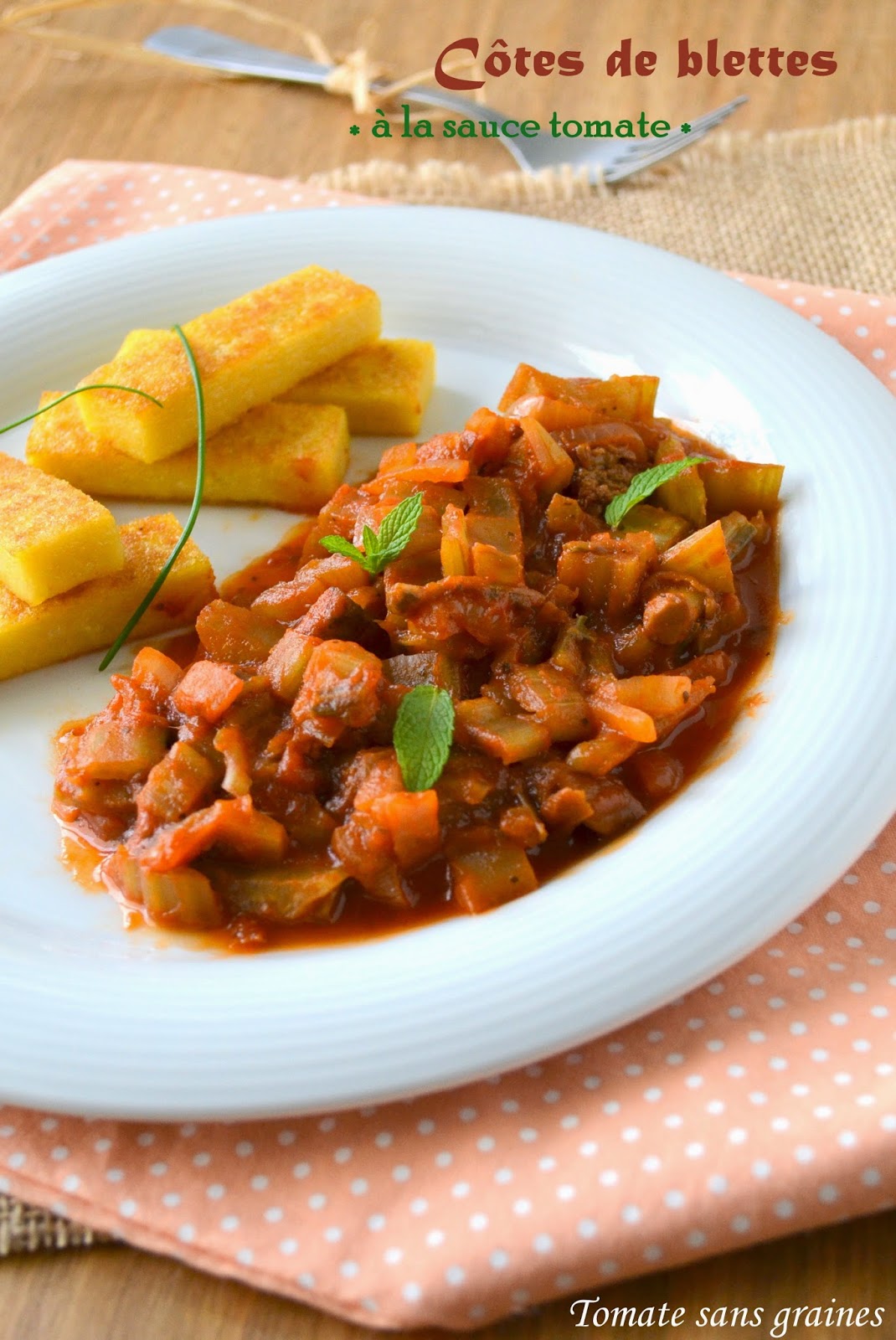 Je n’ai donc utilisé dans cette recette que les côtes, que j’ai simplement agrémentées d’une sauce tomate bien parfumée. Je les ai accompagnées de polenta que j’ai détaillée en bâtonnets avant de les faire dorer dans un peu d’huile d’olive. Les deux se marient fort bien, je trouve.