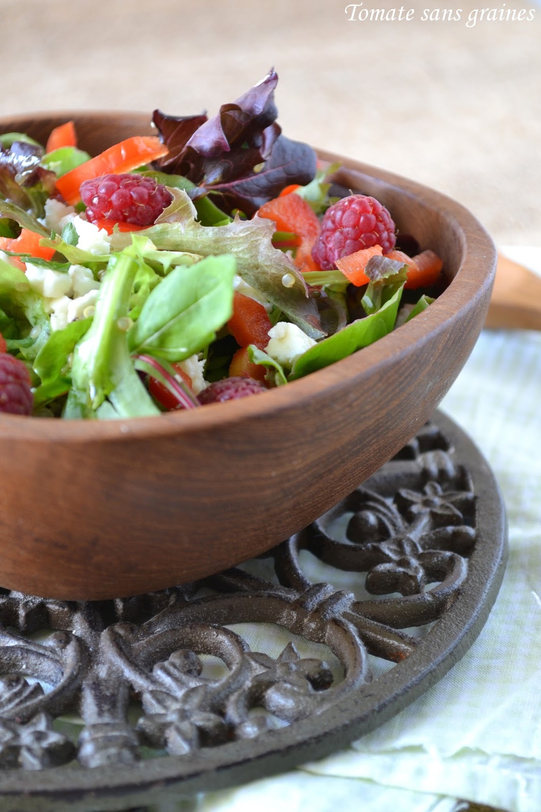 Très jolie salade pleine de couleurs ! J'adore les framboises…