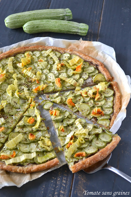 Si, comme moi, vous avez acheté des courgettes comprenant une fleur au bout (qu’elle soit mâle ou femelle), ou si vous avez acheté deux ou trois fleurs tout exprès (et c’est très bien ^^), émincez ces dernières (retirez le pistil) et répartissez-les sur la tarte à la sortie du four.