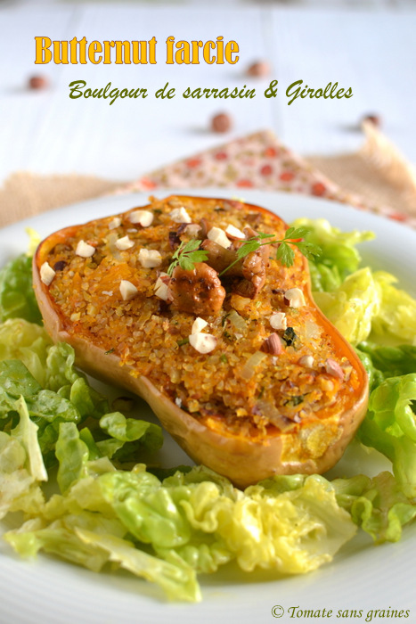 Un plat qui fleure bon l’automne : de la courge butternut et des champignons, auxquelles s’ajoutent des noisettes récoltées à la fin de l’été et du boulgour de sarrasin, dont j’adore la saveur si particulière, un peu sauvage, rustique, et qui, je ne sais pas pourquoi, me fait également penser à cette saison qu’est l’automne. 😉
