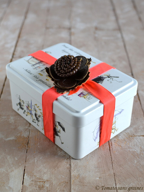 - Boîtes en métal, pour offrir de petites douceurs par exemple… mais pas que ! N’hésitez pas à faire preuve d’originalité en y plaçant des cosmétiques solides, un livre… Entourée d’un joli nœud coloré, la boîte se suffit à elle-même pour conserver l’effet de surprise puisqu’on ne voit pas ce qu’elle contient. Et elle fait aussi partie du cadeau du coup. Si vous n’avez pas de boîte en métal chez vous, n’hésitez pas à aller en chiner dans les vide-greniers. 😉