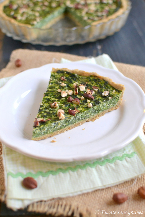 Voici une recette généreuse en épinards, qui plaira aux adeptes de ce légume ! ^^ Une tarte, aux épinards donc, avec une pâte bien souple et parfumée à l’huile d’olive, des noisettes qui apportent une agréable saveur torréfiée ainsi que du croquant, et enfin de la ricotta, fromage à pâte fraîche peu gras et peu calorique, qui apporte un peu de douceur pour équilibrer le tout… Que demander de plus ? ^^