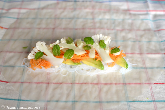 5. Répartissez la garniture sur la moitié inférieure de la galette, en laissant de l’espace sur les bords : un peu de salade, des vermicelles, un peu de carottes, de chou-fleur, d’avocat (3 à 4 tranches par rouleaux) et plusieurs feuilles de menthe pour apporter de la fraîcheur.