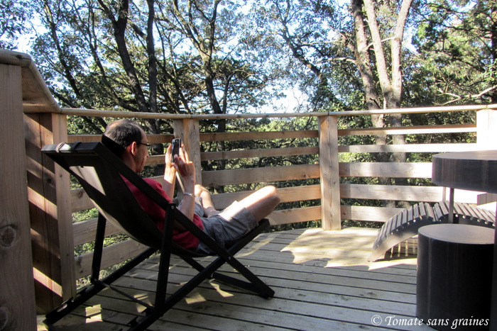 En conclusion, j’ai vraiment beaucoup apprécié ce séjour insolite et, même si l’on ne se retrouve pas véritablement perchés dans les arbres, comme un oiseau pourrait l’être dans son nid, on s’y sent très bien et la magie opère. J’ai beaucoup aimé passer du temps sur la terrasse, entourée de nombreuses cimes d’arbres. Nous avons d’ailleurs pris tous nos repas dehors. En parlant de repas, c’est le seul bémol du séjour : nous n’avons pas trouvé le dîner exceptionnel, et nous aurions apprécié un accompagnement avec le plat principal, ne serait-ce que de la salade verte, tout simplement. Quant aux petits déjeuners, j’ai été assez surprise de l’état des tasses dont l’émail était vraiment ébréché. J’en ai d’ailleurs informé le personnel. Mais mis à part ces petits points négatifs (et une porte d’entrée que l’on avait beaucoup de mal à ouvrir et fermer… bah tant pis, on reste dedans, on part plus ^^), ce fut vraiment très agréable et reposant, dans un lieu à la fois dépaysant, nature, cosy, et propice au bien-être, idéal pour se relaxer et se déconnecter du quotidien.