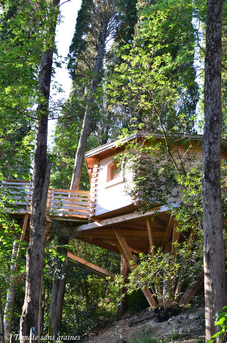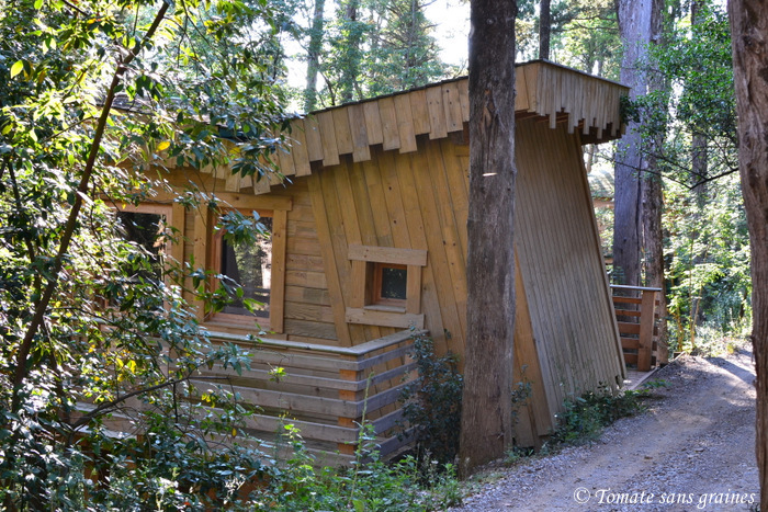 Les cabanes sont regroupées sur une petite partie du domaine, dans un bois. Elles sont accrochées à la pente et reposent sur des pilotis. La sensation de hauteur est plus ou moins palpable, selon les cabanes. Il ne s’agit pas de cabanes construites dans les arbres, qui reposeraient sur des branches, mais bien de cabanes dans les bois, plus ou moins élevées. Moi qui ai le vertige, je n’en ai absolument pas souffert dans notre cabane, mais celle-ci n’était pas très haute. On n’accède d’ailleurs pas aux cabanes par une échelle ou une passerelle dans le vide mais par un petit ponton relié au sentier. Elles ont des dimensions et des formes différentes, et peuvent accueillir jusqu’à 7 personnes. Leur architecture s’intègre très bien à l’environnement.