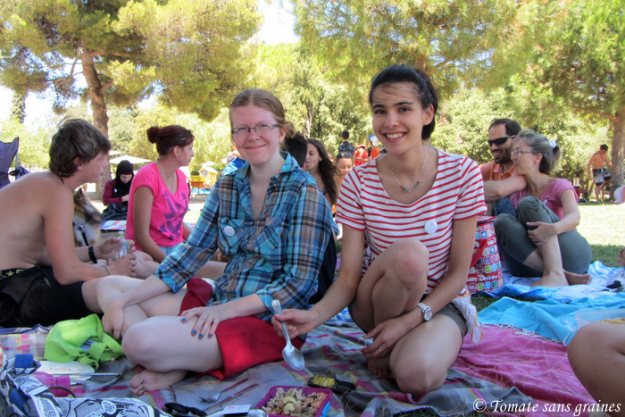 On commence à sortir les victuailles : pour ma part, j’ai apporté une pissaladière et une salade de pois chiches, concombres et tomates (sans graines, of course ^^) à partager. Ma cousine a quant à elle préparé un cake citron-mascarpone et une bouteille d’eau citronnée à la menthe.