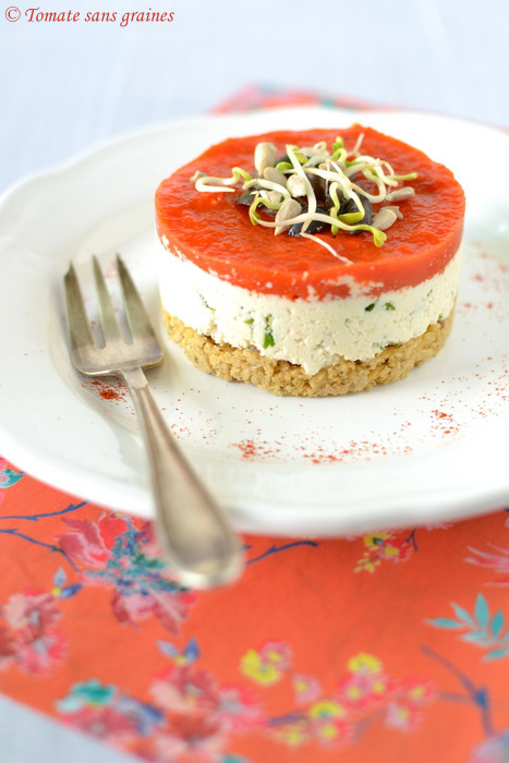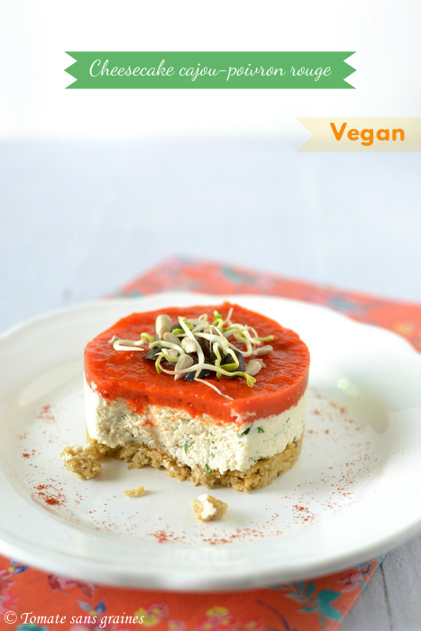 Un cheesecake 100 % végétal, et en version salée, histoire de changer un peu. 😉 C’est une recette de Lili, du blog Au vert avec Lili qu’on ne présente plus, qui m’a fait de l’œil il y a de nombreux mois, et depuis, l’idée d’un cheesecake aux noix de cajou ne m’a plus quittée ! ^^ Il fallait juste que je trouve le temps de le réaliser… et que j’attende également patiemment la saison des poivrons rouges que je souhaitais intégrer dans ma recette. 😉