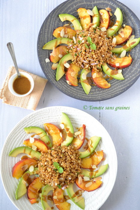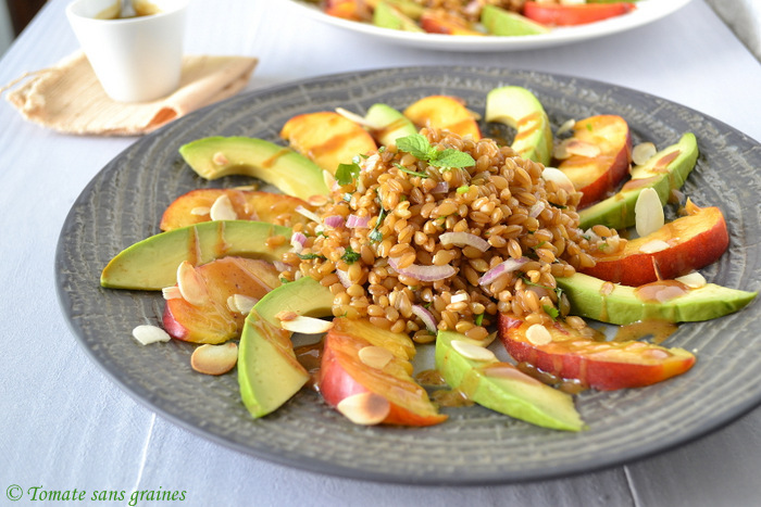 Salade gourmande au petit épeautre {avocat, brugnon & amandes torréfiées}