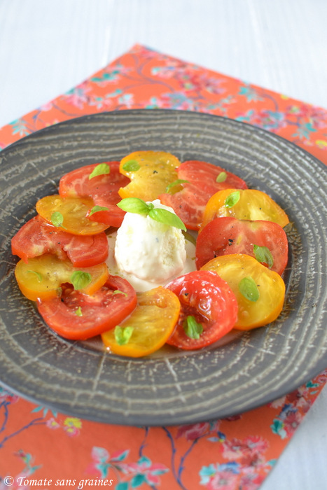 Carpaccio de tomates et sa glace mozzarella-basilic… Ou comment revisiter la tomate-mozza !