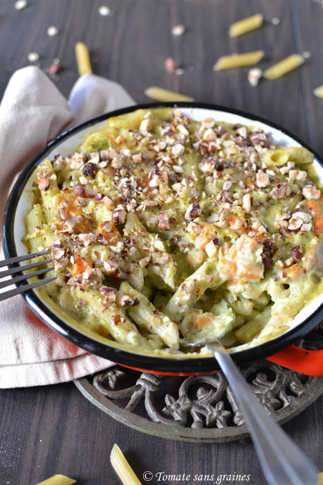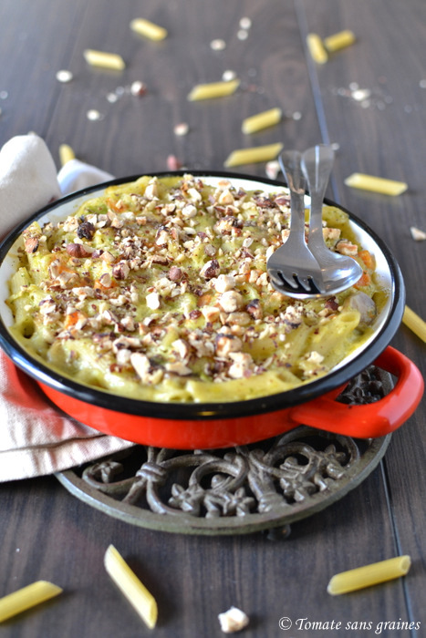 Ce gratin est généreux, gourmand et sans gluten. J’ai toujours beaucoup de mal à trouver des pâtes sans gluten qui soient bonnes, tant au niveau de la texture que du goût, et pour le coup, celles de la marque Sans Pour Cent, ne sont vraiment pas mal du tout ! Pour ce qui est du pesto qui l’agrémente, j’ai choisi un pesto de fanes, car, comme vous le savez, je ne gaspille rien en cuisine. 😉 Et, oui, les fanes de légumes ne sont pas bonnes qu’à être jetées au compost ou données à manger aux lapins ! ^^ Selon la saison, ce que vous avez dans votre jardin ou votre frigo – ou même au congélateur car le pesto se congèle -, libre à vous d’utiliser des fanes de radis ou de navet pour cette recette, voire un mélange des deux. 😊