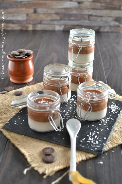 Alors voilà, je tiens parole (bon, en même temps j’avais dit « essayer » , je ne m’engageais donc pas avec certitude, mais quand je dis que j’essaye, généralement je fais au final 😉). Alors sans plus attendre – c’est que j’ai encore du pain sur la planche avant ce soir –, voici la recette du jour : une panna cotta saveur noix de coco et chocolat noir. Un dessert très simple (oui, en ce moment, je ne me casse pas la tête, pas le temps, vous l’aurez compris ! ^^), mais néanmoins gourmand. 😊