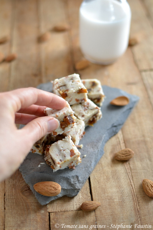 La dernière fois, je vous avais proposé des cookies à l’okara, cette fois, ce sera des bouchées gourmandes, sans cuisson (je fais uniquement fondre à feu doux l’huile de coco avec la purée d’amande). 😊 Ça fait déjà quelque temps que j’en réalise, mais si mes souvenirs sont bons, c’est une recette de la très talentueuse Marie Laforêt qui m’a inspirée.