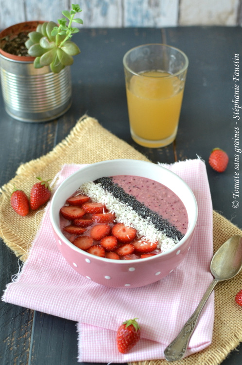 Voici une idée de petit déjeuner sain, vitaminé et coloré comme je les aime. 😊 Ça change du granola ou des tartines à la confiture. 😉 Il vous faut une base « liquide-mais-pas-trop-non-plus » , plutôt onctueuse, généralement du lait ou du yaourt mixé avec un ou plusieurs fruits frais ou surgelés (banane, framboises…), et plein de petites choses gourmandes et variées en guise de topping : oléagineux, fruits secs et/ou frais, graines diverses, copeaux de chocolat (noir, of course)… Faites-vous plaisir et laissez libre cours à votre imagination et vos envies au gré des saisons et de ce que vous avez dans vos placards ! 😉