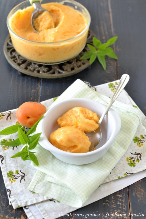 Pour ce qui est du miel présent dans la recette, je vous conseille de goûter la préparation avant la mise en sorbetière, afin d’en adapter la quantité selon votre goût (et selon la teneur en sucre des abricots).