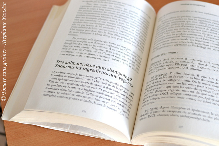 Cet ouvrage aborde tous les aspects du véganisme : nutrition et santé (alimentation, carences, compléments alimentaires…), éthique (animale, sociétale, environnementale…), exploitation et souffrance animale, industrie de la laine, du cuir, zoos, cosmétiques, marques de chaussures véganes, explication des labels existants… absolument TOUT ce qui a trait à l’exploitation animale est passé au peigne fin. Même la question des tatouages ! C’est dire si Ophélie est allée loin dans ses recherches ! Elle vous prend par la main, avec bienveillance, vous indiquant par exemple de manière précise comment remplacer les œufs ou la crème fraîche au cas par cas en cuisine, par quoi remplacer le cuir ou encore quelle méthode privilégier pour devenir végane. Elle ne vous lâche pas jusqu’à la fin. Mais elle est aussi très crue dans ses propos, comme vous allez le voir ci-après. Elle nous dévoile sans ambages l’horreur du commerce de la fourrure, du dépeçage des animaux encore vivants ou encore des électrocutions anales ou génitales pratiquées.