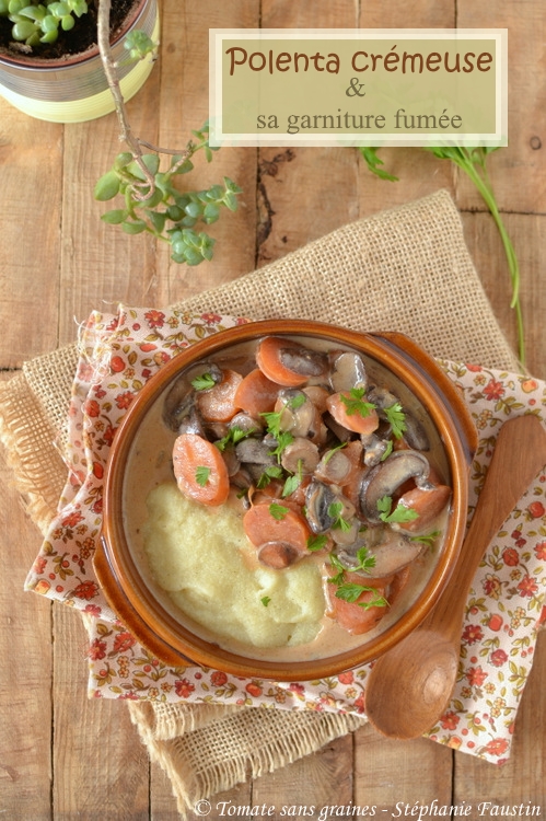 Alors pour se réchauffer, on concocte de bons petits plats chauds et réconfortants, tels qu’une délicieuse polenta et ses légumes à la crème et au paprika fumé. 😉 Ma polenta est à base de semoule de millet, mais libre à vous de choisir de la semoule de maïs, plus traditionnelle. Cette recette m’a été inspirée par Willy, chef du restaurant Vegan Gorilla, auquel j’ai déjà consacré un article, qui m’a fait goûter son plat devant lequel je bavais l’autre jour… Merci Willy ! ^^ Nos deux recettes sont toutefois bien différentes puisqu’il utilise de la semoule de maïs, qu’il ne met pas de carottes (ni d’autres légumes me semble-t-il) et que ses champignons sont fumés par je ne sais quel procédé dont il a le secret. 😉 Moi, je les fume au paprika fumé, c’est ma botte secrète à moi quand je veux obtenir une saveur fumée, et ça marche généralement plutôt bien. 😊 Pour ce qui est des carottes, je pense qu’une fondue de poireau pourra aisément les remplacer (ou les compléter à raison de moitié-moitié), ou même de la courge, afin de varier les plaisirs.