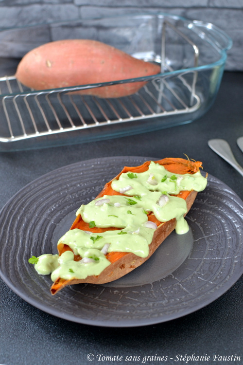 5. Pendant la cuisson, préparez la sauce en mixant tous les ingrédients ensemble. Au moment de servir, ouvrez la/les patate(s) douce(s) en deux. Salez légèrement et nappez généreusement de sauce à l’avocat.