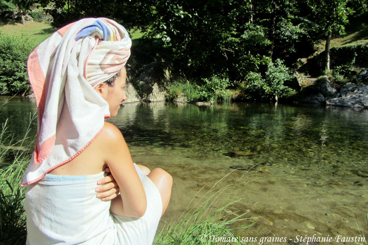 Rien de tel qu’un bon bain glacé à la rivière ! 😜 - Du fond de teint : je ne me maquille absolument pas, mais j’ai très régulièrement des boutons d’acné, qui me laissent par la suite de belles marques sur le visage pendant trèèèès longtemps. 😔 Du coup, je les masque comme je le peux… Généralement, si je pars deux ou trois jours, et qu’au moment de partir je n’ai pas de boutons installés ou de marques trop visibles, je ne prends pas mon fond de teint avec moi. Sinon, si je pars plus longtemps, que j’ai des boutons et/ou des marques, je l’emmène. Je sais parfaitement qu’il faut laisser la peau respirer dans ces cas-là, mais bon, je me sens mieux en masquant ces imperfections… J’évite déjà de le faire lorsque je suis chez moi et que je ne vois personne !