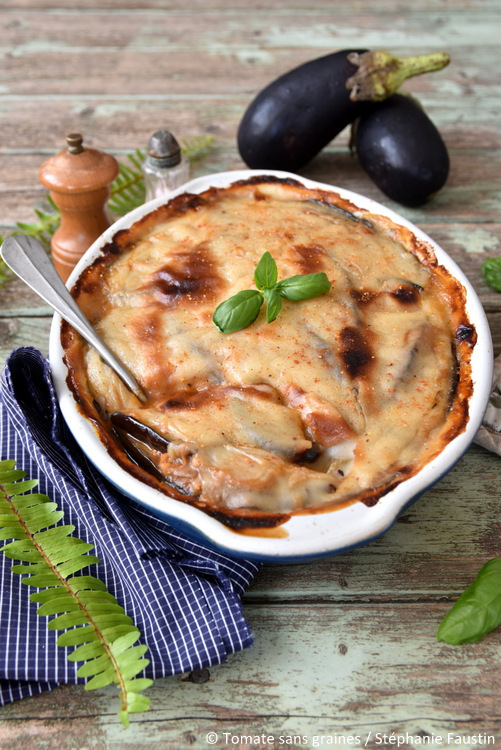 D’origine grecque, la moussaka se prépare traditionnellement avec de la viande d’agneau ou de mouton. Ici, point de viande : cette dernière est remplacée par des protéines de soja texturées, mais vous pourrez tout aussi bien opter pour du tofu ferme ou du tempeh. Et si vous ne consommez pas de soja, pourquoi ne pas essayer avec une légumineuse telle que le pois chiche, la lentille corail ou encore le haricot rouge ? 😏