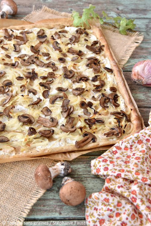 Je vous en propose une version un peu différente, avec une pâte levée à base de farines d’épeautre ancien et de petit épeautre, mais surtout végétalienne : ici, les champignons viennent remplacer les lardons, et la crème ou le fromage blanc sont remplacés par du yaourt au soja. J’ai mis 200 g de yaourt, mais je trouve qu’il en manquait un peu, donc je vous note dans la recette 300 g et là, je pense que ça sera parfait. 😊