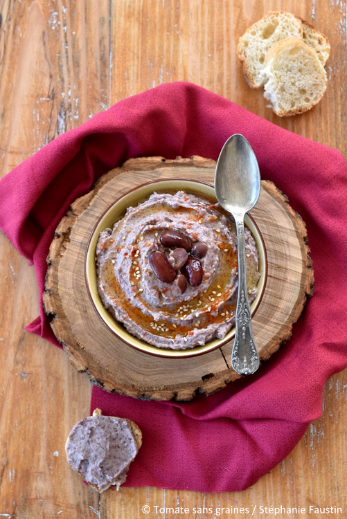 Vous connaissez ma passion pour l’houmous sous toutes ces formes, eh bien, en voici un que je n’avais pas encore testé : l’houmous de haricots rouges. Et pour le parfumer, j’ai choisi d’y incorporer quelques olives noires, plus précisément la caillette de Nice, mais vous pouvez tout à fait la remplacer par une autre variété d’olive noire si vous ne pouvez pas vous procurer cette petite olive niçoise. 😏