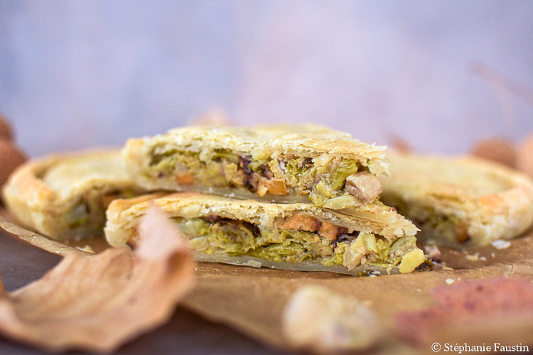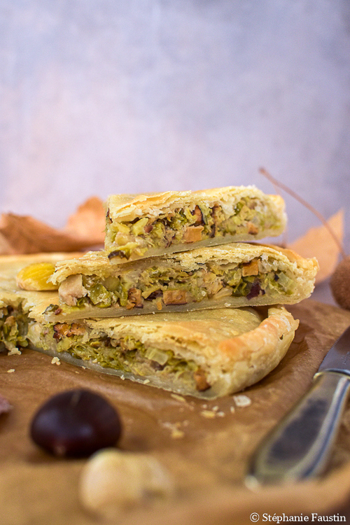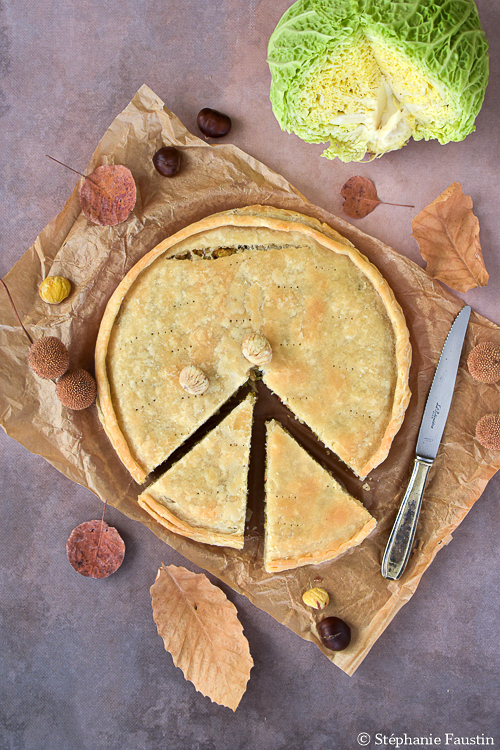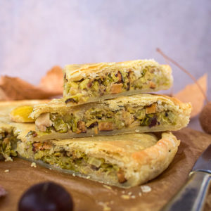 Je l’associe à du chou frisé, dans une tourte à base de pâte feuilletée. Pour la petite histoire, je me suis toujours rappelé une tourte similaire, avec des lardons et de la crème fraîche, découverte dans un restaurant il y a fort longtemps, quand j’étais petite, alors que nous étions en vacances avec mes parents en… Ardèche ? 🤔 Franchement je ne me souviens plus de la région, mais je me dis que ça pourrait bien être ça vu que c’est la région de la châtaigne. Oui, ça fait cliché, je sais. 🙃