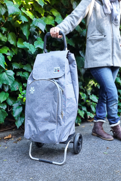 J’ai opté pour le chariot Carlux – Sac 65 L isotherme – Chiné Gris, que l’on voit sur les photos. J’aime sa couleur passe-partout, un gris clair que je trouve assez moderne, sobre, élégant et minimaliste. Mais comme déjà dit, il y a des chariots à motifs et bien plus colorés si c’est ça qui vous plaît ! 😉