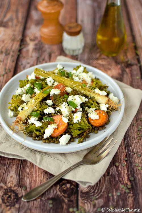 Lentilles du Puy, légumes rôtis et fromage de brebis frais