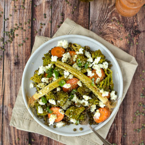 J’ai trouvé l’inspiration pour cette recette au travers… d’aumônières de lentilles aux épinards et à la feta, rencontrées dans un vieux livre de cuisine ! 😅 Le lien est mince – juste les lentilles et du fromage de brebis –, mais cela m’a suffi pour partir dans des contrées créatives. Point d’aumônières, mais je me suis dit : « Tiens ! Et si je faisais rôtir des légumes pour aller avec mes lentilles ? Et puis, j’émietterais bien du fromage dessus au moment de servir. Mmmh, j’ajouterais bien aussi des graines, du vert de cébette cru et de l’huile d’olive pour les finitions. Tout cela donnera de la couleur à mes lentilles, je suis sûre que ce sera joli et goûtu ! ».