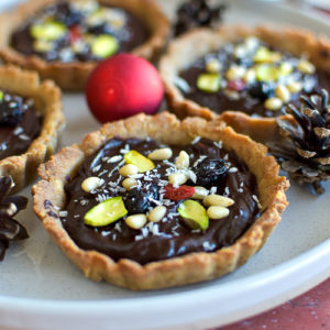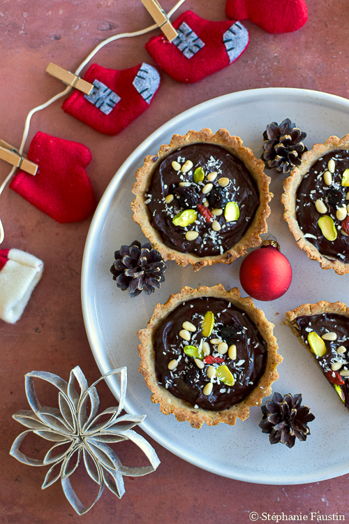 Je termine le menu de Noël que je vous ai concocté avec un dessert chocolaté 🍫. J’ai eu l’idée de combiner une tarte au chocolat classique à des mendiants de Noël. En gros, de réaliser des mendiants sur une pâte ! 😁