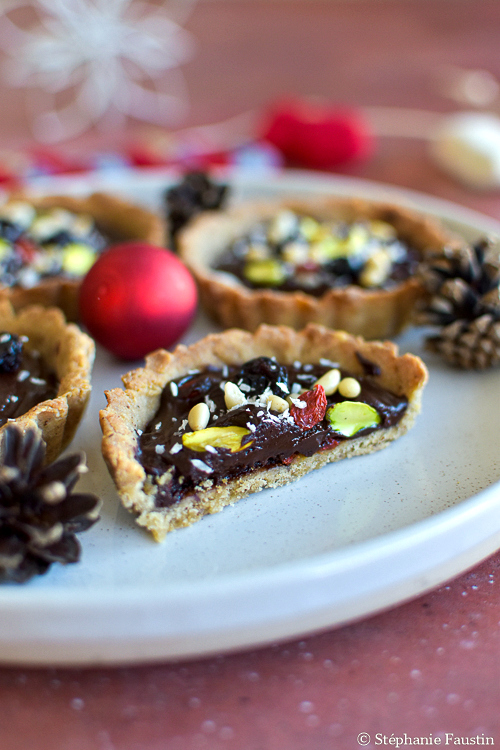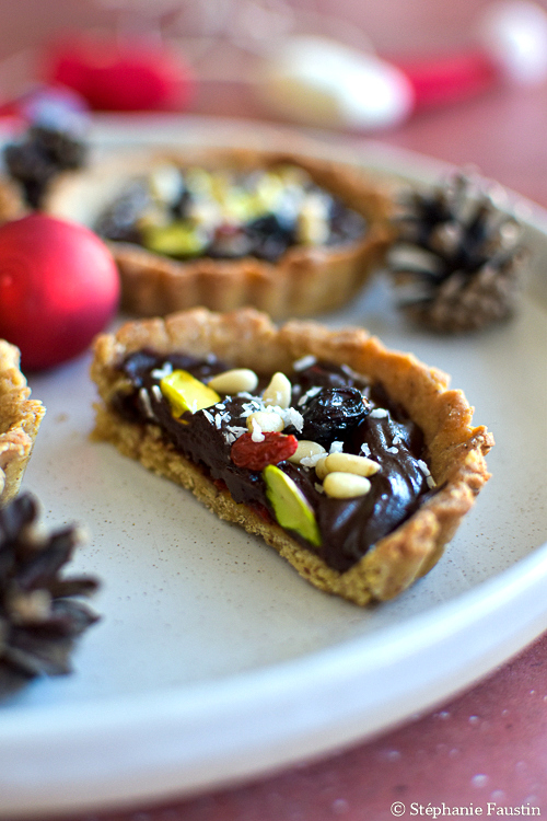 - Parsemez de pistaches, cranberries et pignons. Ajoutez également une baie de goji par tartelette pour rappeler ce qui se cache à l'intérieur. Je n'en mets pas plus car non réhydratées, elles ont tendance à coller aux dents, ce qui n'est pas très agréable. Alors qu'à l'intérieur, nickel ! 😊 Enfin, saupoudrez de noix de coco râpée.
