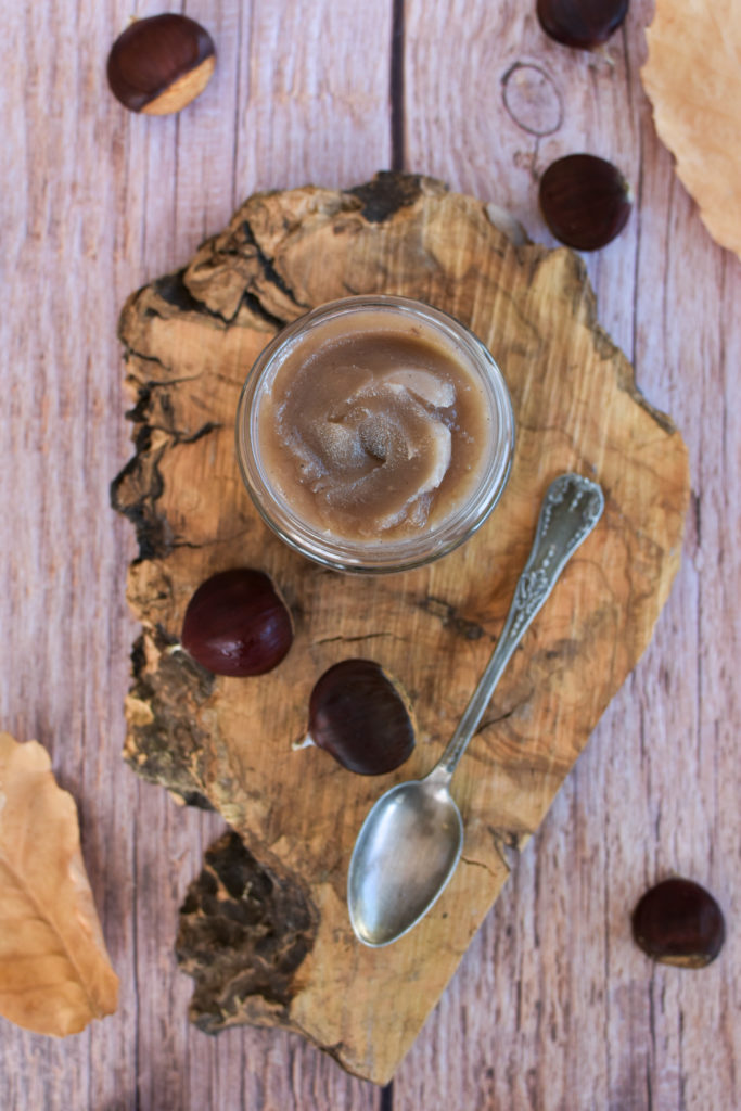 On est ici sur une généreuse couche de crème, comme vous pouvez le constater sur les photos. 😉 Je n’ajoute pas de sucre, ma crème de marrons maison apportant à mon goût suffisamment de sucre à elle seule (375 g de sucre pour 500 g de châtaignes). Vous pouvez d’ailleurs en retrouver la recette dans mon e-book Cuisine sauvage au rythme des saisons.
