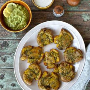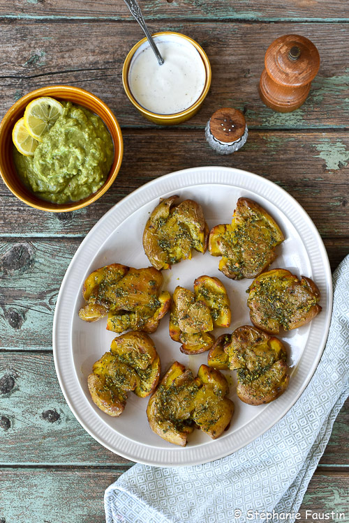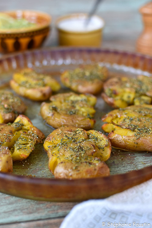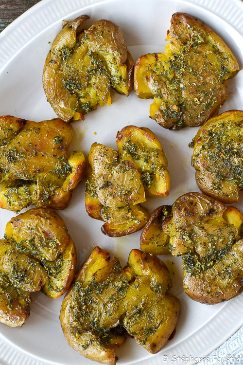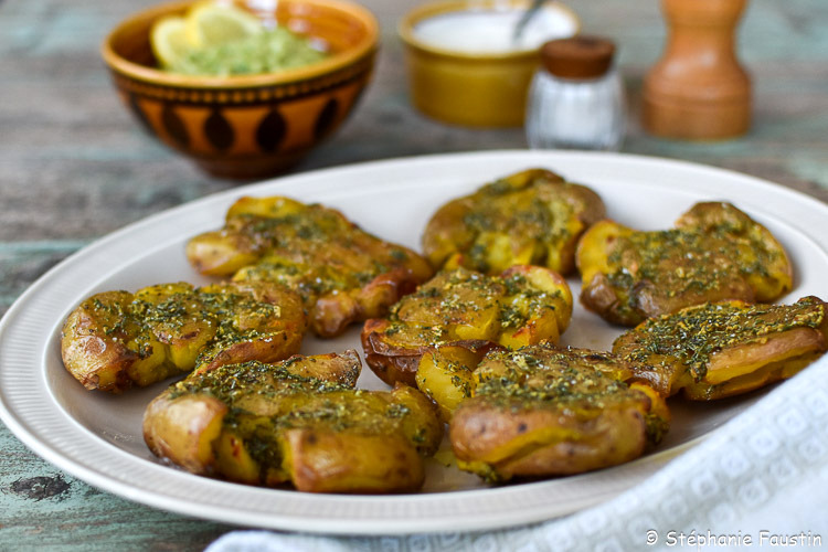 Les smashed potatoes, « pommes de terre écrasées » ou « tapées » en français, constituent une recette simplissime qui permet d’obtenir des pommes de terre très gourmandes, parfumées, dorées et croustillantes. Avec ce côté rustique et authentique que l’on apprécie… en tout cas, moi oui ! 😛