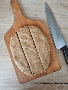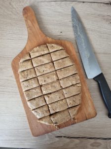 - À l'aide d'un grand couteau de cuisine, découpez l'ensemble en morceaux. Si ce ne sont pas des rectangles, ce n'est pas grave. 😉