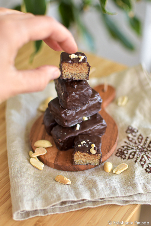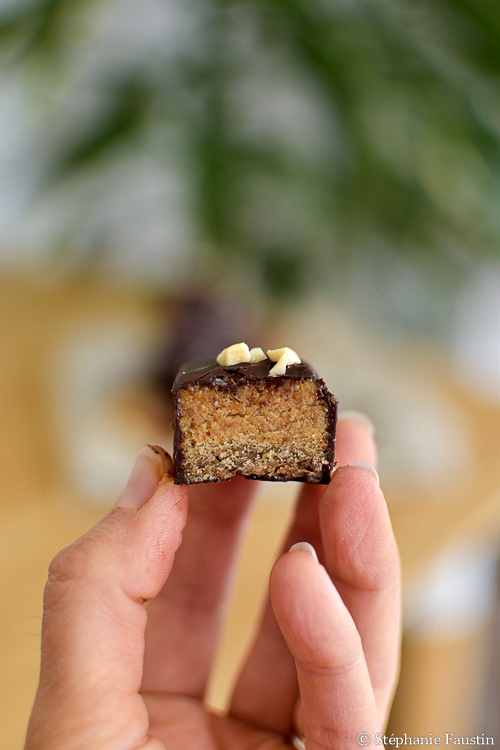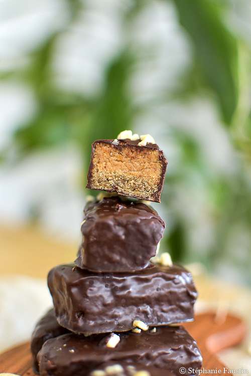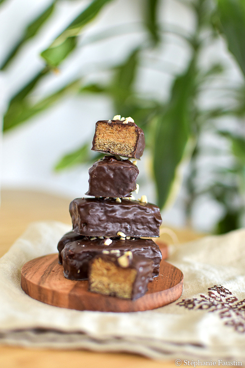 Donc voilà, je vous présente mes barres façon Snickers-Twix… et un peu Milky Way. Pour la base, j’ai réalisé une pâte sablée végane et sans gluten. Mais n’importe quelle pâte sablée que vous avez l’habitude de faire conviendra. Une fois cuite à blanc et refroidie, je l’ai surmontée d’une couche de « caramel » de dattes et de purée de cacahuète, dans lequel j’ai ajouté une pincée de sel, de la vanille et des morceaux de cacahuètes torréfiées. C’est dommage, on ne les voit pas dans la barre que j’ai coupée pour les photos, mais il y en a bien ! J’ai ensuite délicatement procédé au découpage en morceaux (on s’en fiche s’ils ne sont pas tous de la même taille). Enfin, j’ai fait fondre du chocolat noir pour les en enrober. Et j’ai laissé sécher au frigo.