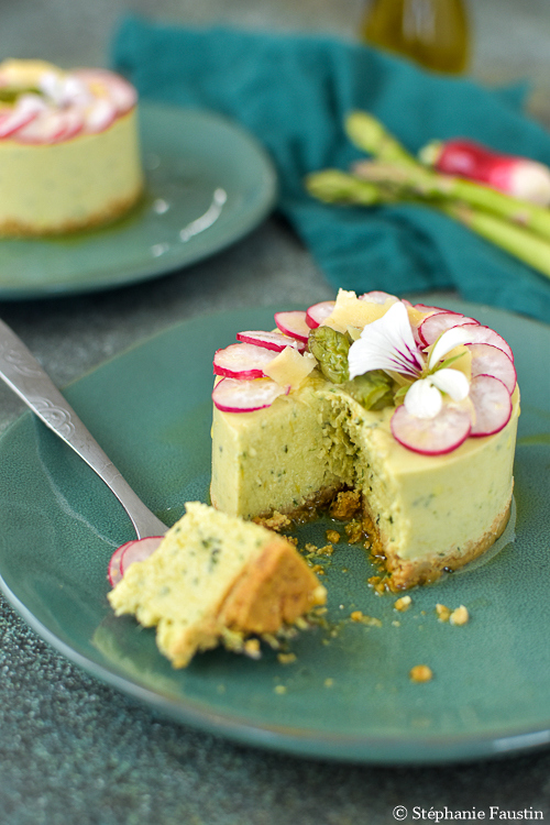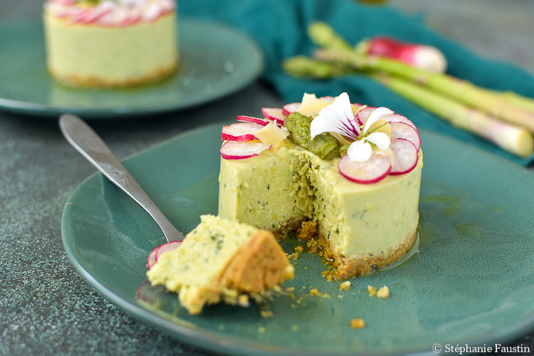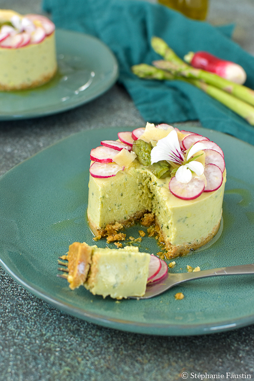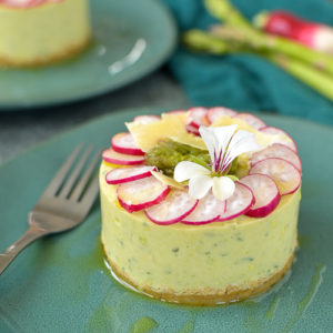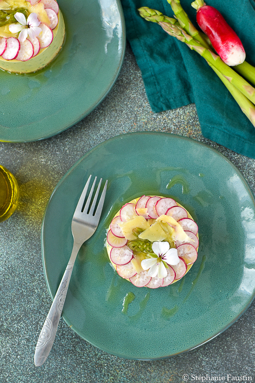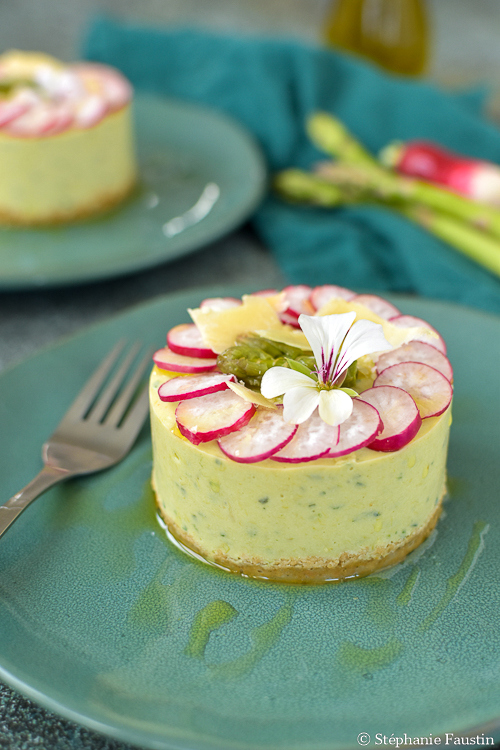- Retirez les cercles à pâtisserie et décorez de tranches de radis, de têtes d'asperges et de copeaux de parmesans (végan), et pourquoi pas de fleurs comestibles si vous en avez.