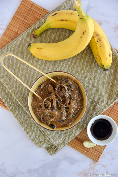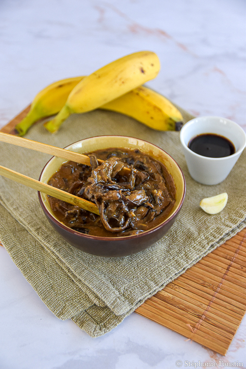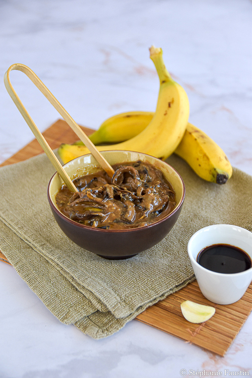 Aujourd’hui, c’est une recette salée que je vous propose : un effiloché de peaux de banane laquées, aux saveurs asiatiques. C’est très simple à réaliser, goûteux, et ça se marie très bien avec du riz.
